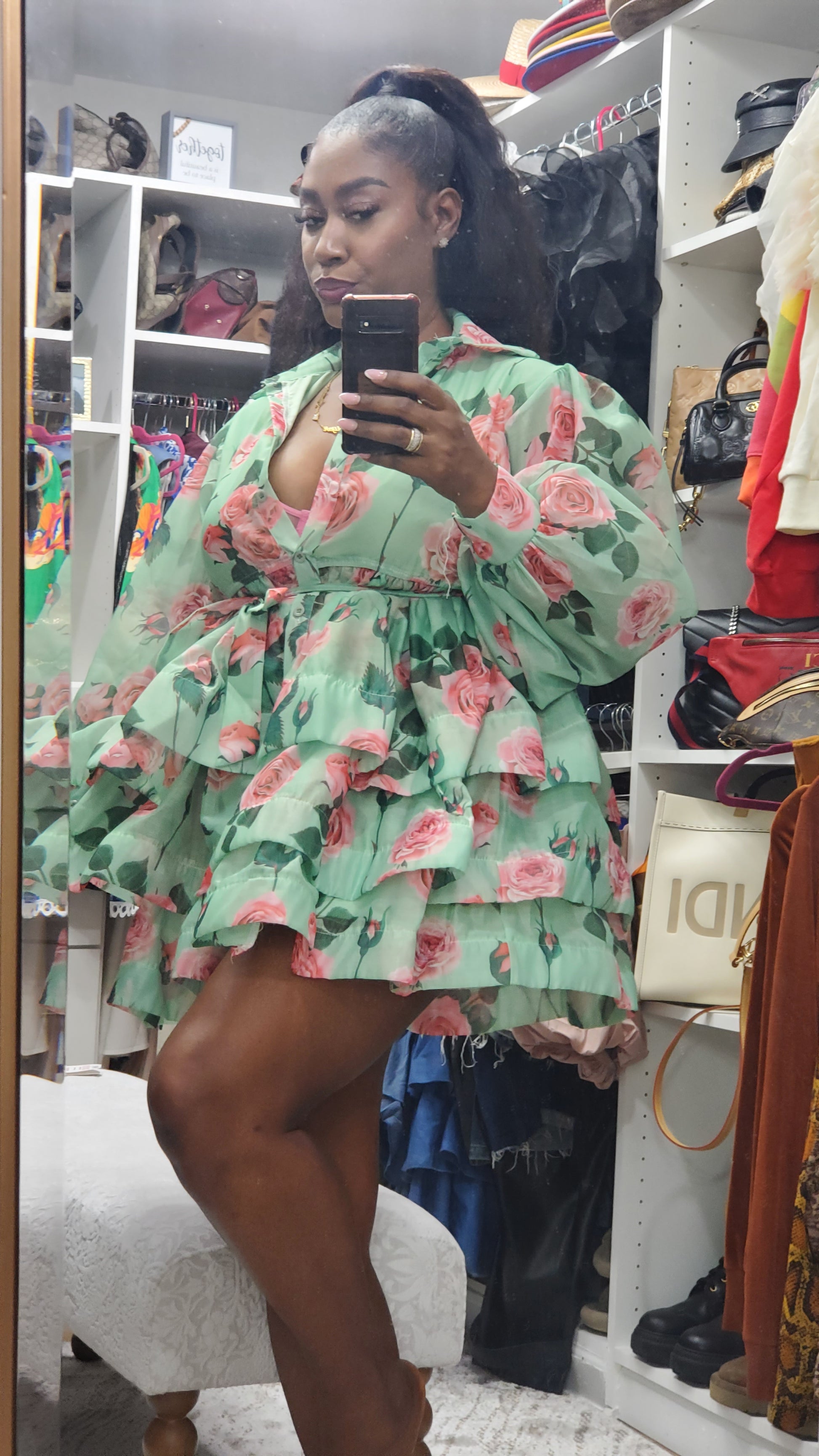 Long Sleeve Floral Print Tiered Mini Dress. Polyester/ Chiffon Material. Comes in Beige and Green