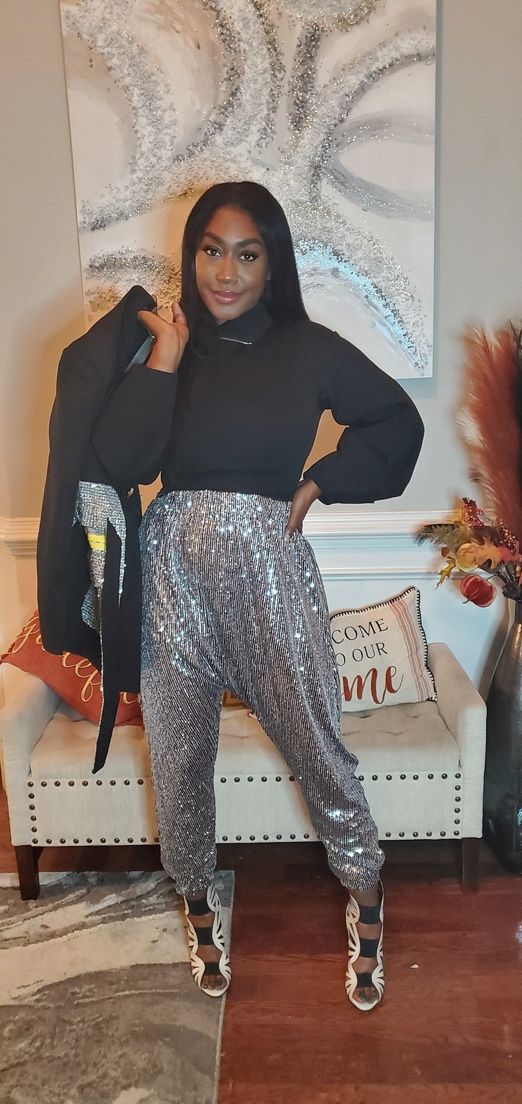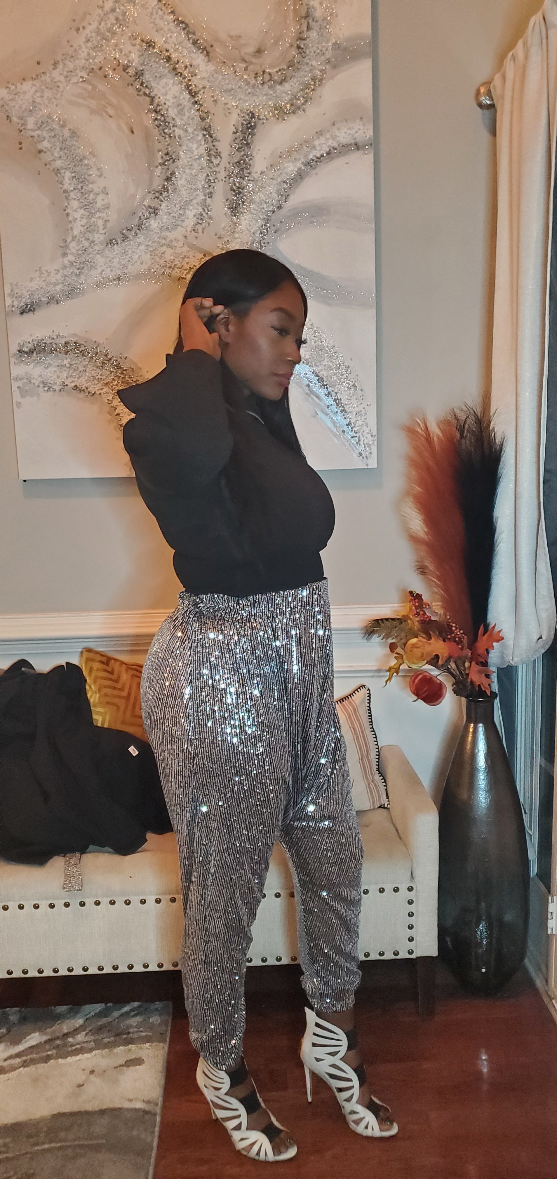 Sparkle and Shine in these Harem High Waist Pants. They have an Elastic Waist and Cuff at the Bottom.  Model is Wearing a Size Medium and wears a Size 10/12 US Pant
